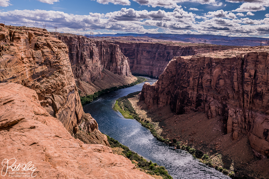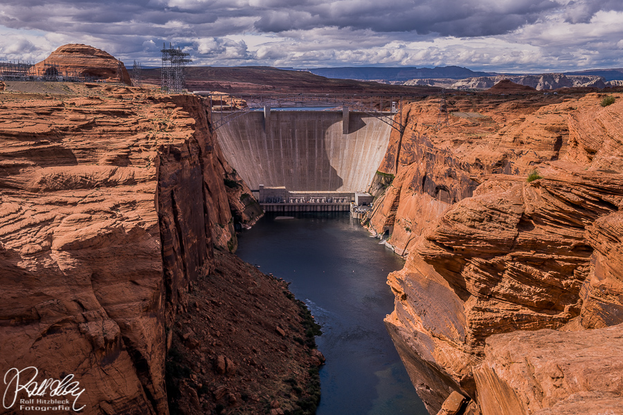 Wir hatten als offenen Punkt noch immer die Navajo Bridge und Lees Ferry. Auf dem Weg dorthin kamen wir in Page an einem Aussichtspunkt vorbei, den wir bisher noch nicht besichtigt hatten. Von einer schroffen Abrisskante hat man einen tollen Blick in das Colorado Tal und den Damm in der anderen Richtung.