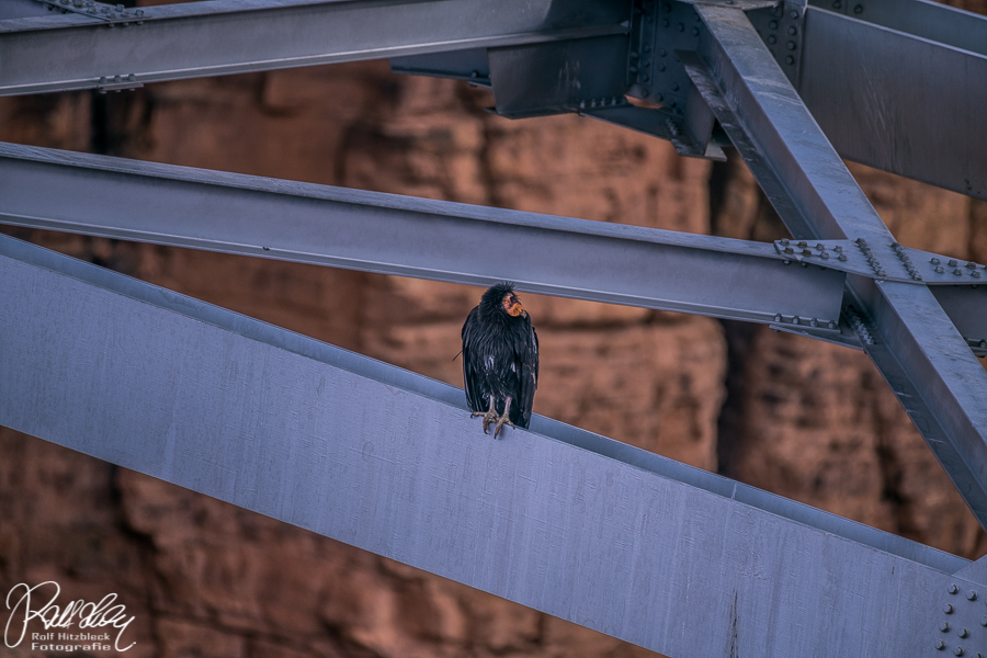 Auf der Navajo Bridge, die sich imposant wie immer über den Fluss spannt, hatten wir früher mal das Nest eines Condor-Pärchen gesehen. Mal schauen, ob sie noch da sind. Das Nest bzw. die weißen Flecken der Darmausscheidungen waren nicht mehr zu sehen, dafür flogen uns drei verschiedene Jungtiere dieser gewaltigen Spezies um die Ohren. Majestätisch lassen sie sich von der Termik nach oben treiben, um ihre Flugkünste zu vervollkommnen oder nach Nahrung zu suchen.