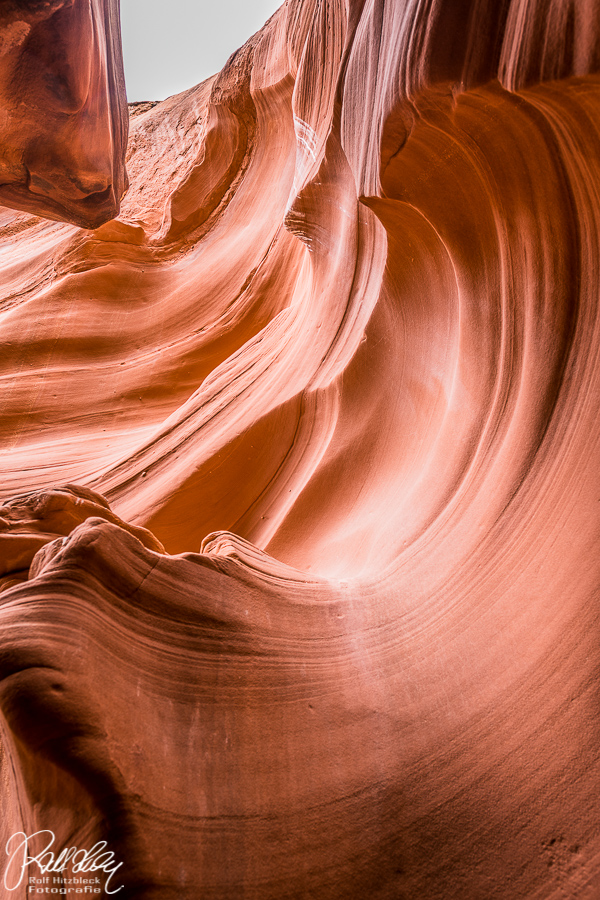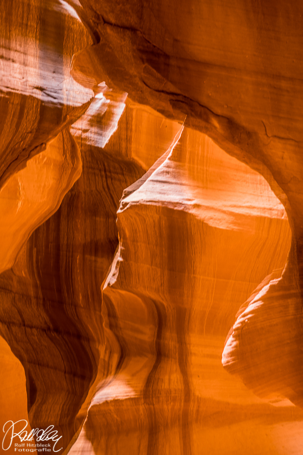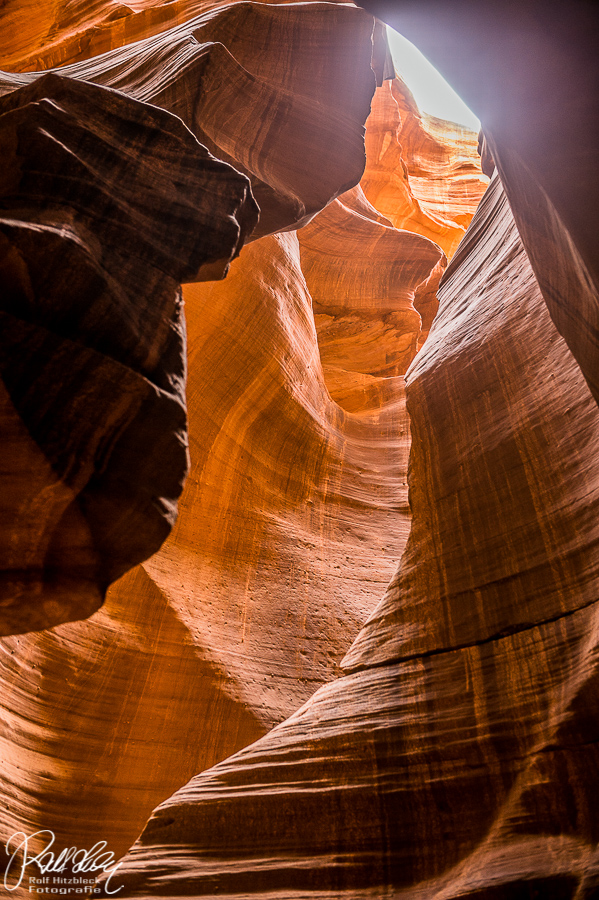 Dann ging es wieder zurück, um sechs weitere Fotobegeisterte abzuholen in den Upper Antelope Canyon. Hier trennte sich die Spreu vom Weizen. Die Mitglieder einer Fototour wurden deutlich besser behandelt als das normale Fußvolk. Aber auch hier war strikte Organisation angesagt: Wer hat extreme Weitwinkel? Du gehörst zu Lower Section, der Rest zur Upper Section. Was bedeutet das nun wieder? Das erfuhren wir am ersten Fotostop. Steven zeichnete mit dem Fuß einen Strich in den Sand und bedeutete der „Lower Section“, mit eingefahrenem Stativ hinzuknieen, damit sich die Upper Section mit ausgefahrenen Stativbeinen hinter uns aufstellen konnte und beide Parteien gleichzeitig knipsen konnten. Für die Zeit von zwei Minuten war der Canyon für uns Fotografen wirklich gesperrt. Kurz vor Ablauf hieß es: 30 Seconds, 15 Seconds und dann marschierten die Fußtruppen wieder durch unser Sichfeld. So ging es hin und her, kreuz und quer.
