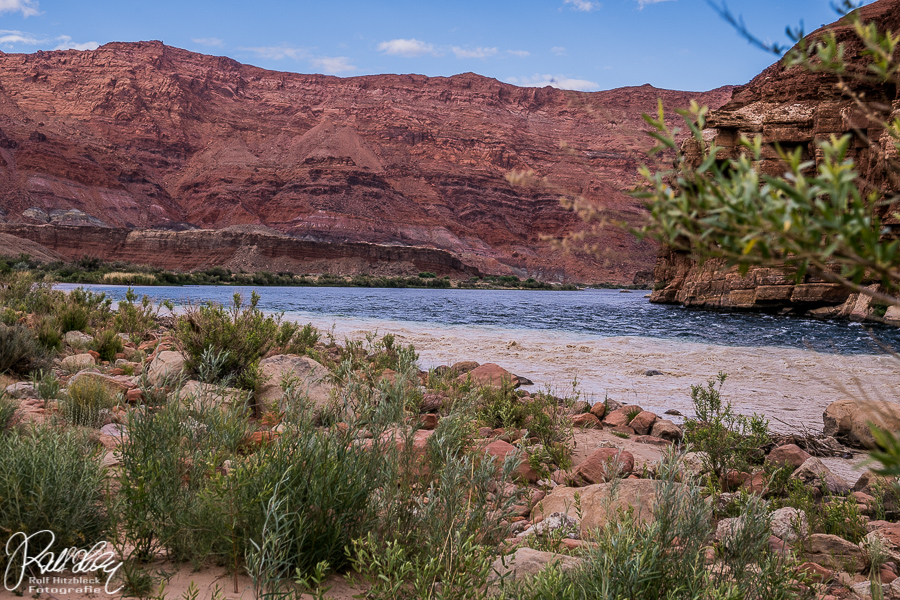 Letzter Punkt: Der Colorado bei Lees Ferry. Kommt er aus der einen Ecke noch klar und grün dahergeplätschert, belädt er sich an dieser Ecke mit Sand und setzt seinen Weg als schlammige Brühe fort.