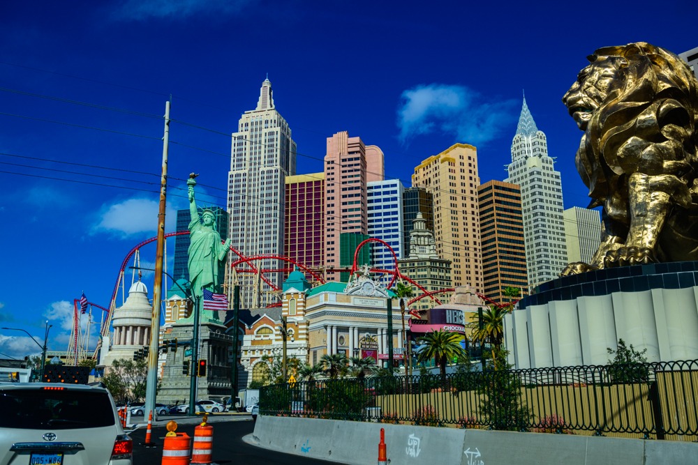 An einer Ampel nutze ich die Gelegenheit, das New York, New York abzulichten. Rechter Hand der Löwe des MGM Grand.