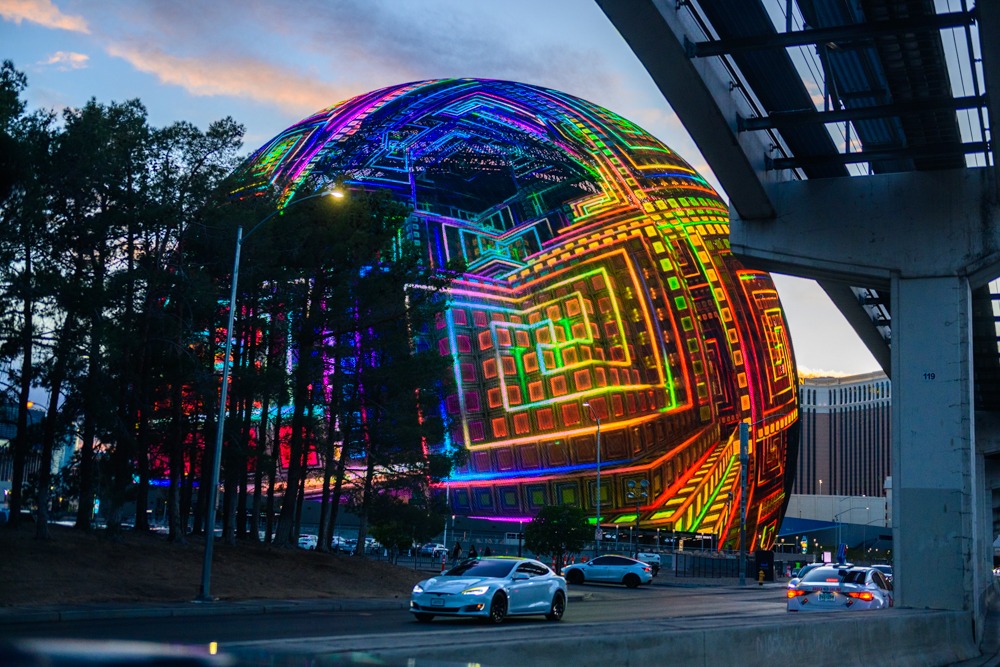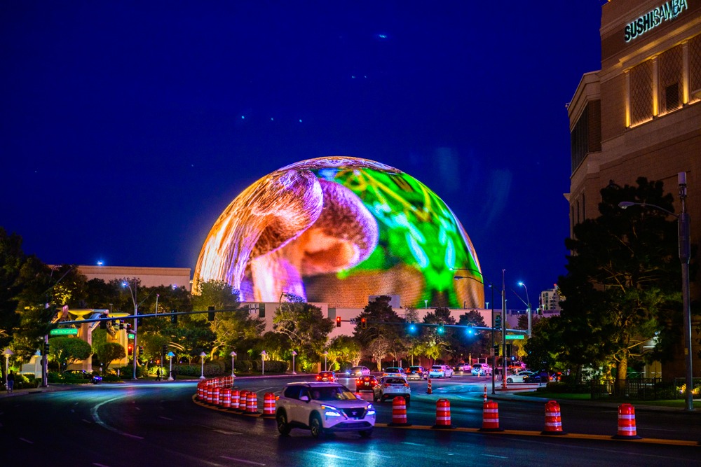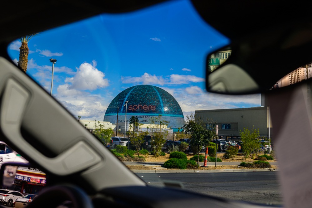 Da die Läden (bis auf Walmart) erst um 10 Uhr aufmachen, beschlossen wir, einen kurzen Ritt über den Strip zu unternehmen und zu scouten, wo man denn parken kann. Mittlerweile sind die früher kostenlosen Parkplätze der Kasinos zu wichtigen Einnahmequellen geworden. Und wir wollten doch unbedingt mal die neueste Attraktion „The Sphere“ sehen. Chanael vom Empfang unseres Hotels empfahl uns, das Parkhaus des Treasure Island zu benutzen, das sei als einziges noch kostenlos. Also gaben wir dies in unser Navi ein und bummelten gemütlich mit dem Auto über den Strip dorthin.