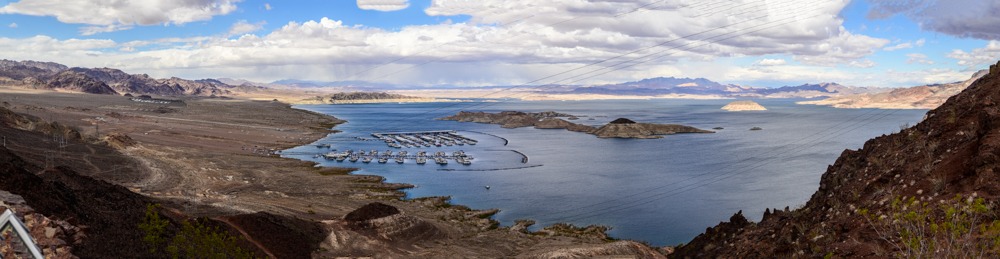 Dann fährt man die Serpentinen runter und im Schritttempo über den Damm, um die ganzen Fußgänger nicht von der Straße zu schubsen. Wir passieren das riesige Parkhaus, das schätzungsweise 400 Autos Zuflucht bietet (für 10 USD pro Auto) und klettern auf der anderen Seite wieder den Berg hoch. Mehrere Aussichtspunkte geben den Blick auf den Lake Mead frei.