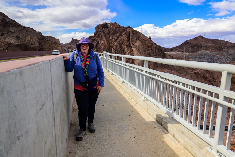 Die Straße führt bergab und an einem großen Parkplatz halten wir, um den obligatorischen Gang über die Mike O’Callaghan – Pat Tillman Bridge anzutreten. Ist einfach notwendig, um meiner Wanderin die Höhenangst abzutrainieren. Noch steht sie nicht am Geländer, aber das üben wir noch.