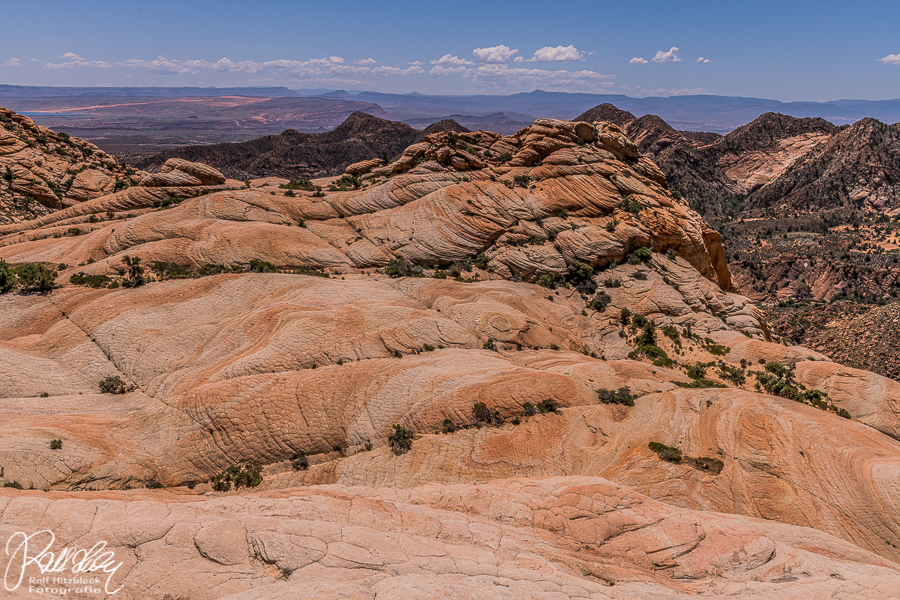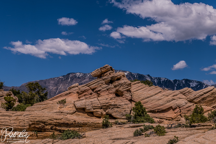 Zum Standardprogramm an Wanderungen in St. George gehört auch der Besuch von Yant Flat. Dies ist eine Felsenlandschaft, welche im Endeffekt direkt nördlich der Stadt liegt. Leider ist sie nicht auf direktem Weg zu erreichen. Wir fahren dazu auf dem Interstate 15 nach Norden, um bei der Ausfahrt Leeds den Weg in die Berge zu nehmen. Nach wenigen Meilen durch ein sehr schönes neues Wohngebiet (tolle Häuser, ehrlich) endet der Asphalt und wir hoppeln ca. 8 Meilen auf der Danish Ranch Road (031) bis zum Parkplatz vom Trailhead. Google Maps hatte uns als kürzere Route die Fahrt aus westlicher Richtung vorgeschlagen, aber von anderen Besuchern erfuhren wir im Nachhinein, dass sich dieser Teil in wesentlich schlechterem Zustand befindet. Also alles richtig gemacht.