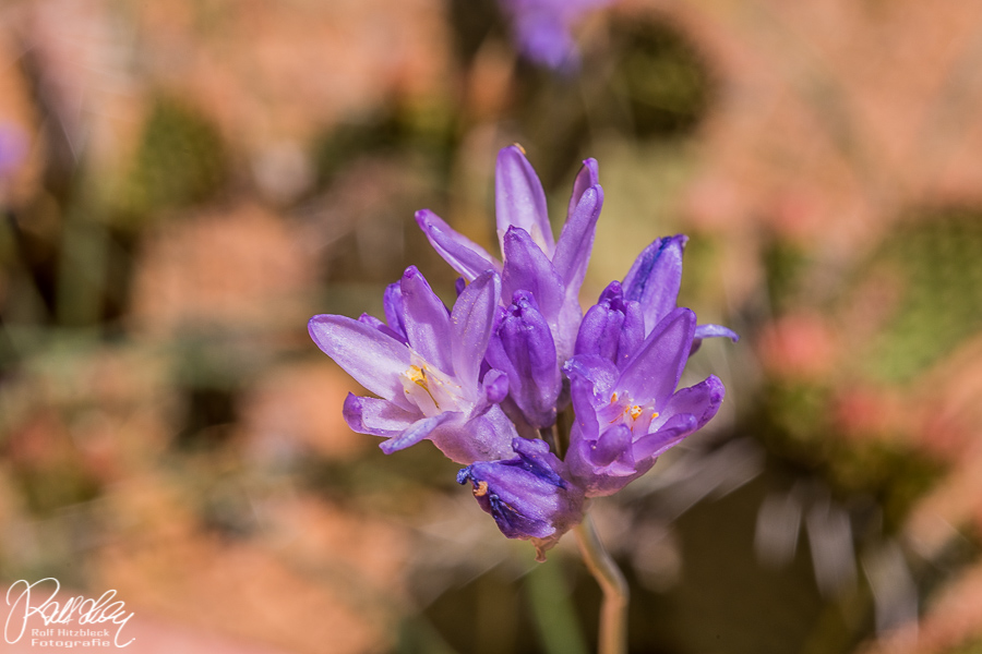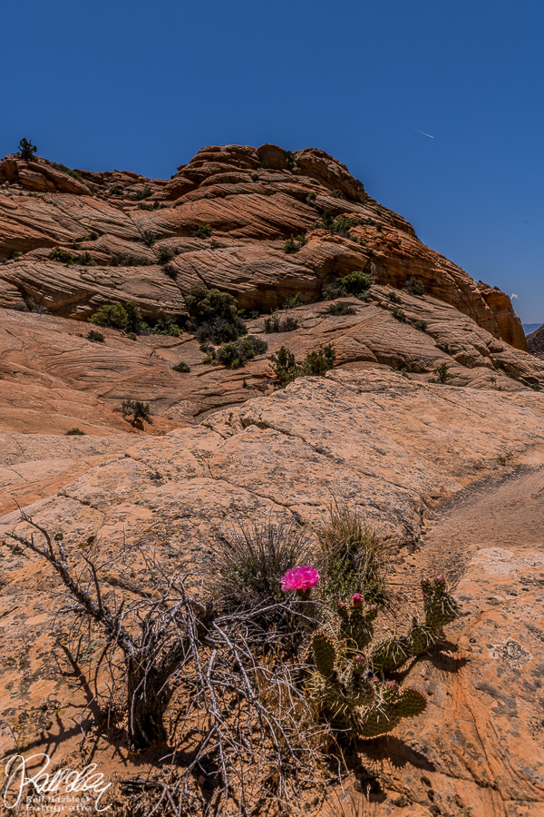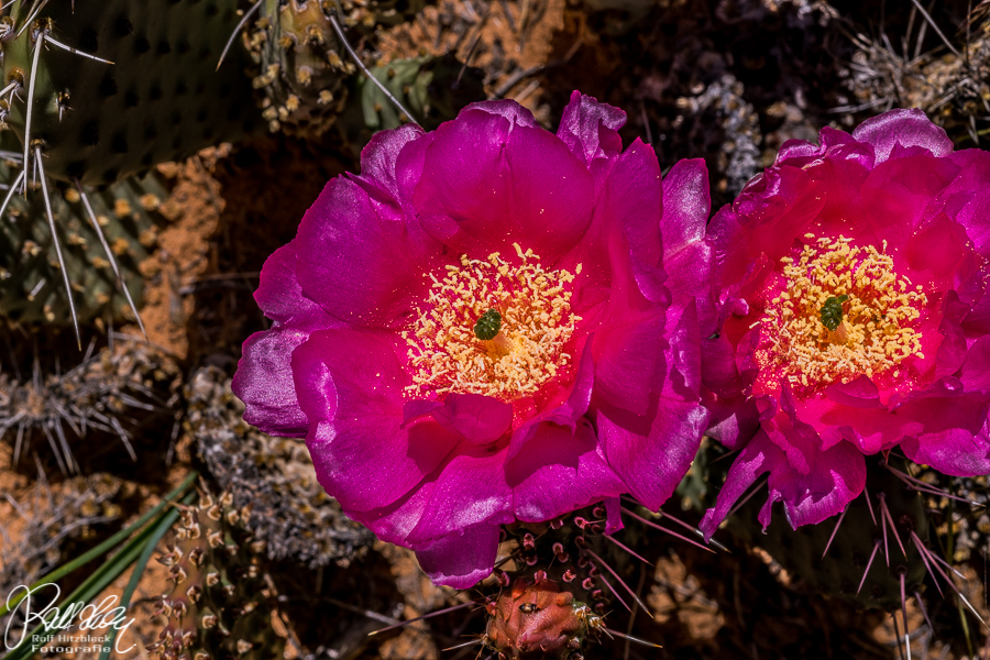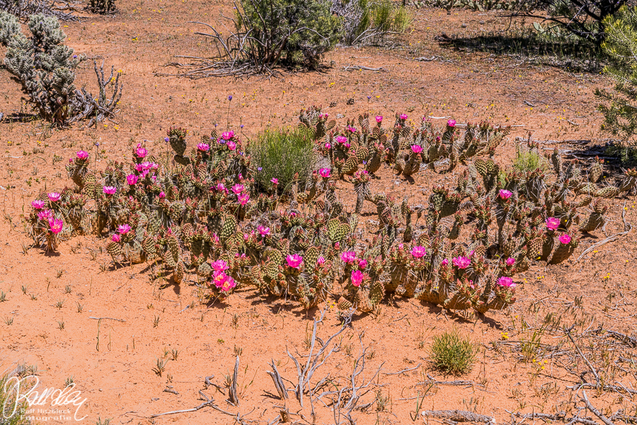 Für den Rückweg packte ich dann das Makro-Objektiv auf die Kamera, um die ganzen Blümchen, die Karin zwecks besserer Wiedererkennung mit einem neongrünen Textmarker angepinselt hatte, aus der Nähe aufzunehmen. Und es ist um diese Jahreszeit absolut wahnsinnig. In jeder Ecke springen einen die rosa- und pinkfarbenen Kakteenblüten an, so als wäre die Natur auf Drogen.