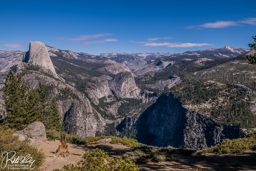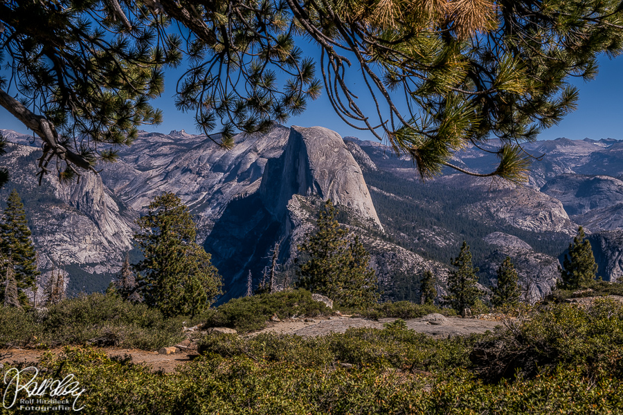 Kurz hinter Wawona (mit eigenem Golfplatz, das braucht der Amerikaner) biegen wir auf die Glacier Point Road ab. Nach weiteren ca. 11 Meilen kommen die beiden Parkplätze in Sicht. Und, oh Wunder, alles rappelvoll. Selbst mit meinen Parkkünsten hätte ich mich nirgendwo legal hinstellen können.