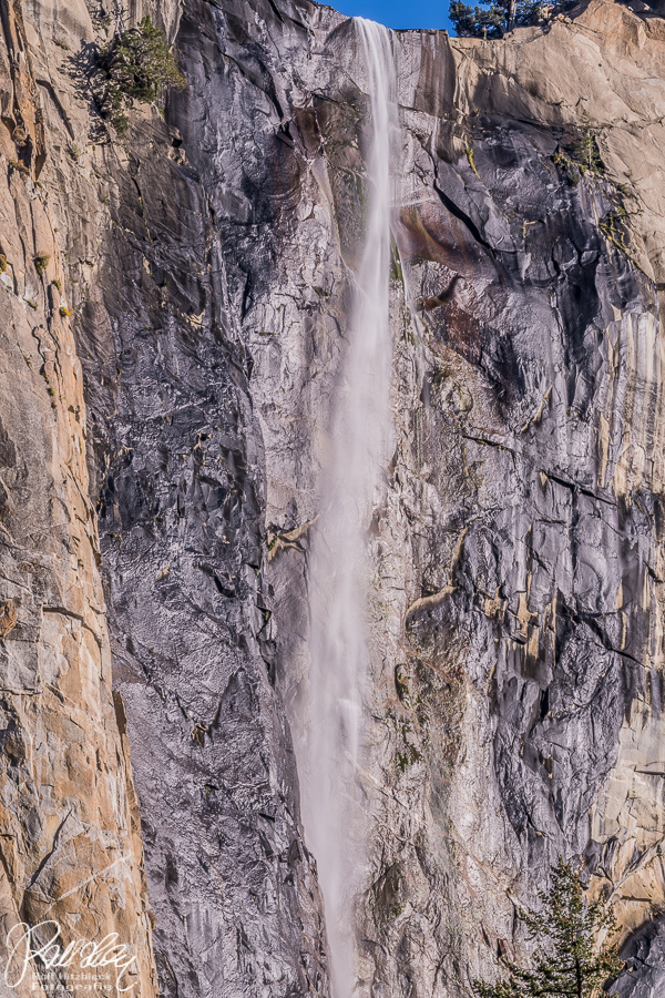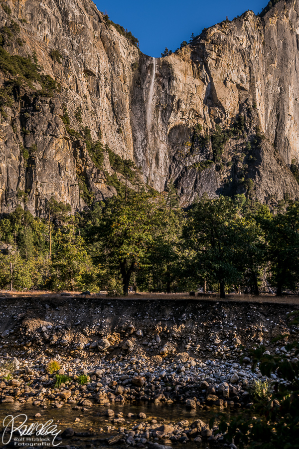 Kurze Zeit später sind wir im Tal angekommen und lassen den Abzweig zu den Bridalveil Falls rechts liegen. Brauchen wir nicht? Doch. Aber ein paar Meter weiter an der Straße gibt es einen Parkstreifen, von dem aus man ohne zu Laufen den Fall auch schön sehen kann. Hier ist er. Je nach Wind in immer anderer Form.